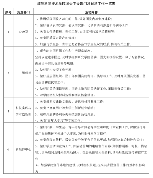 目前,根据本院自身特点及需要,公司团委下设4个部门,分别是办公室、组织部、科技实践和学术创新部和新媒体中心。