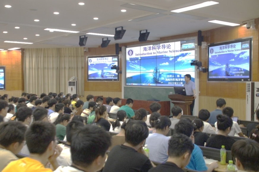 除讲授专业知识外,陈锐还进行了课程思政教育。他从海洋卫星、科考船和载人潜水器等大国重器对我国海洋科学飞速发展的重要作用出发,引用了习近平总书记关于和平发展的重要论述、借用郑和下西洋的例子向同学们全面阐释了海洋强国理念和加快建设海洋强国的重要性,勉励同学们坚定理想信念,加强品德修养,刻苦学习,练就过硬本领,努力把自己培养成有理想有本领有担当的新时代青年,努力成长为海洋强国的合格建设者和可靠接班人。